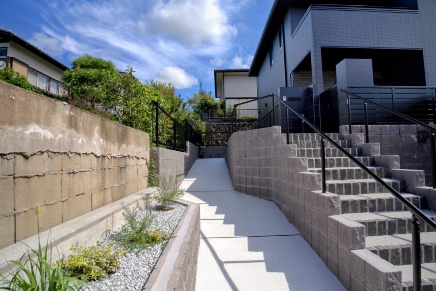 玄関までの動線は、将来ベビーカーや車椅子が必要になった場合でも使いやすいよう、緩やかな勾配と十分な距離を確保。